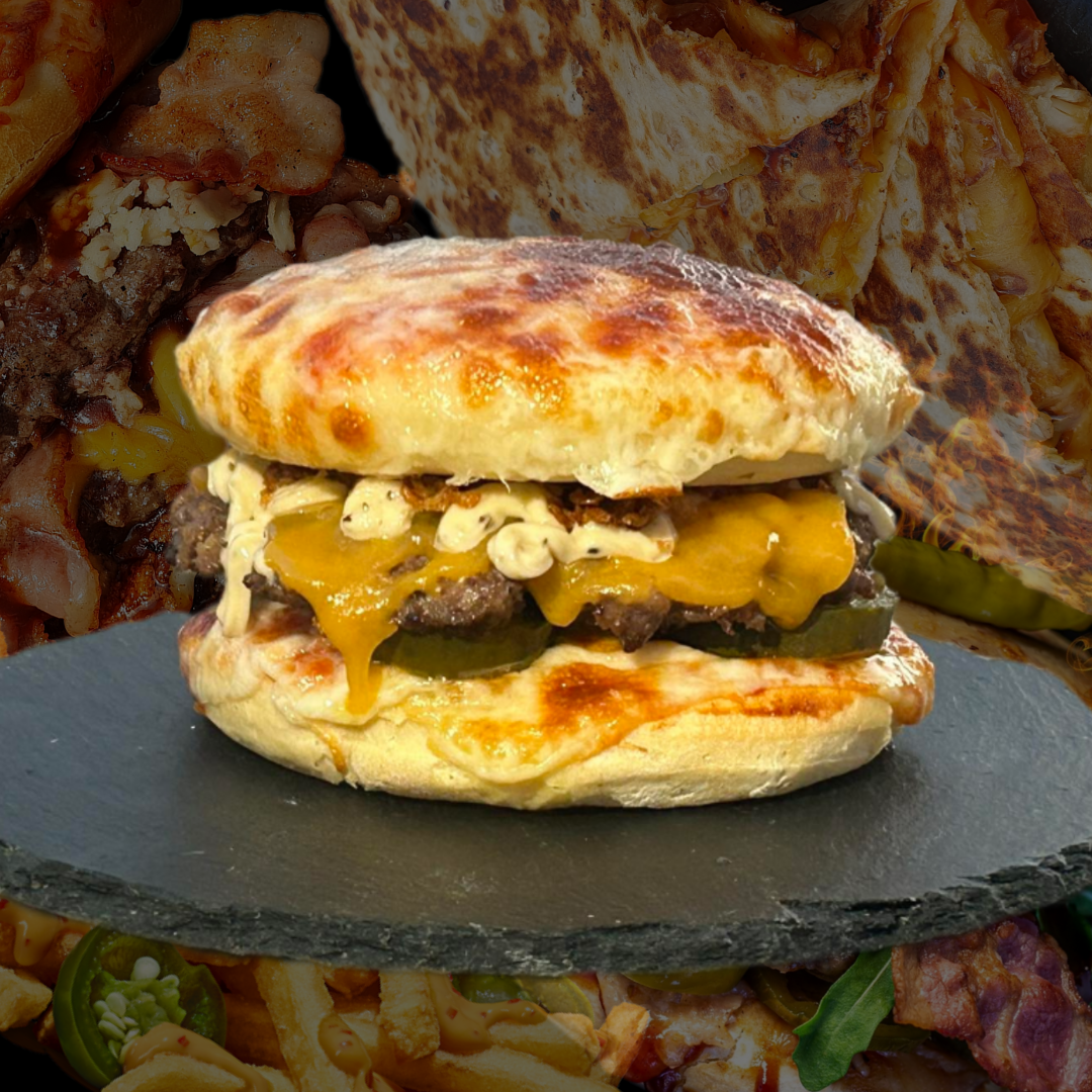 2db minipizza, paradicsomszósz, mozzarella, csemege uborka, 100% marhahús, cheddar sajt, szarvasgombás majonéz, pirított hagyma